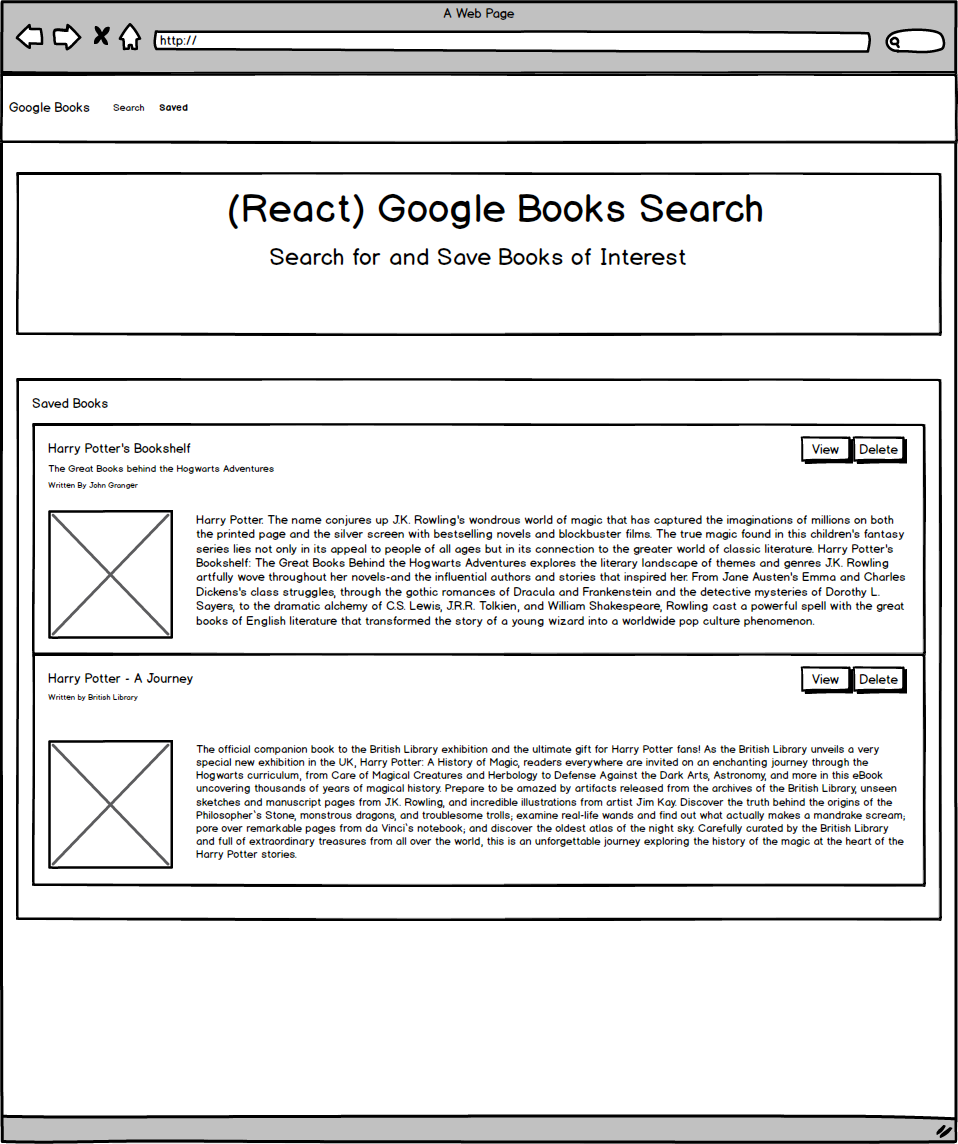 Saved - Renders all books saved to the Mongo database. User has an option to “View” the book, bringing them to the book on Google Books, or “Delete” a book, removing it from the Mongo database.