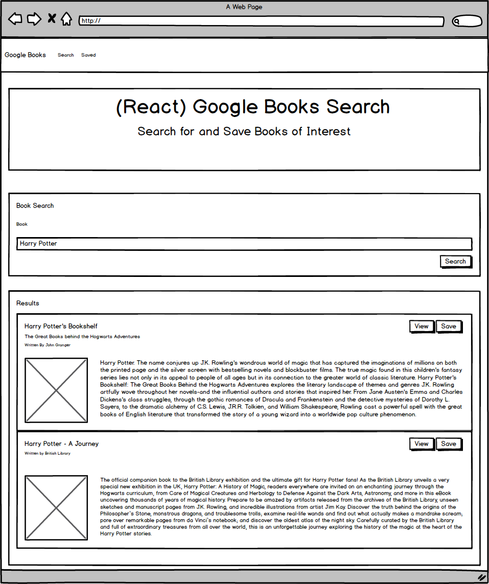 Search - User can search for books via the Google Books API and render them here. User has the option to “View” a book, bringing them to the book on Google Books, or “Save” a book, saving it to the Mongo database.